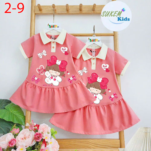 A463503 - Đầm thun cổ trụ may caravat tay ráp lăng xếp ly in viền in cô bé nơ gấu vải thun cotton 4C