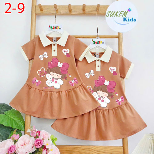 A463504 - Đầm thun cổ trụ may caravat tay ráp lăng xếp ly in viền in cô bé nơ gấu vải thun cotton 4C