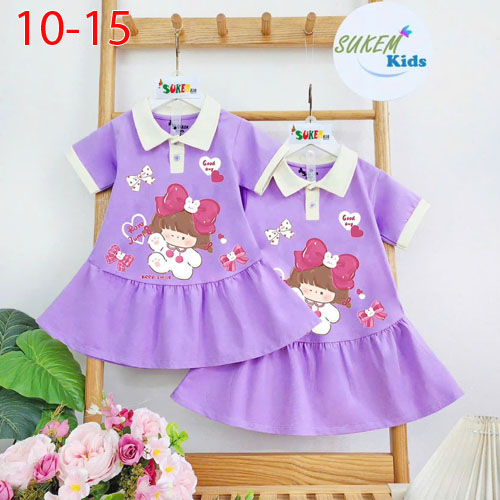 A463506 - Đầm thun cổ trụ may caravat tay ráp lăng xếp ly in viền in cô bé nơ gấu vải thun cotton 4C