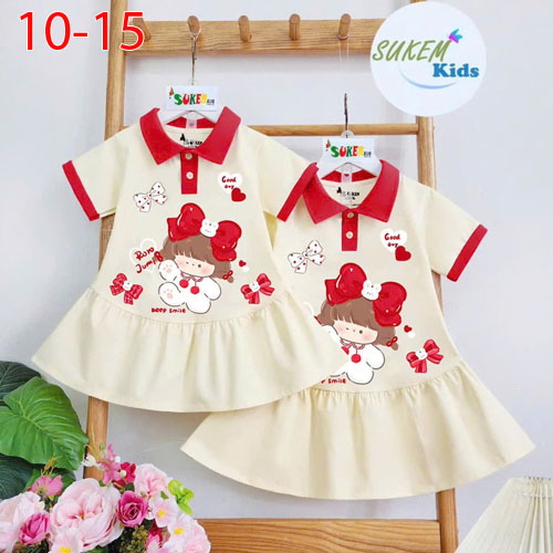 A463509 - Đầm thun cổ trụ may caravat tay ráp lăng xếp ly in viền in cô bé nơ gấu vải thun cotton 4C