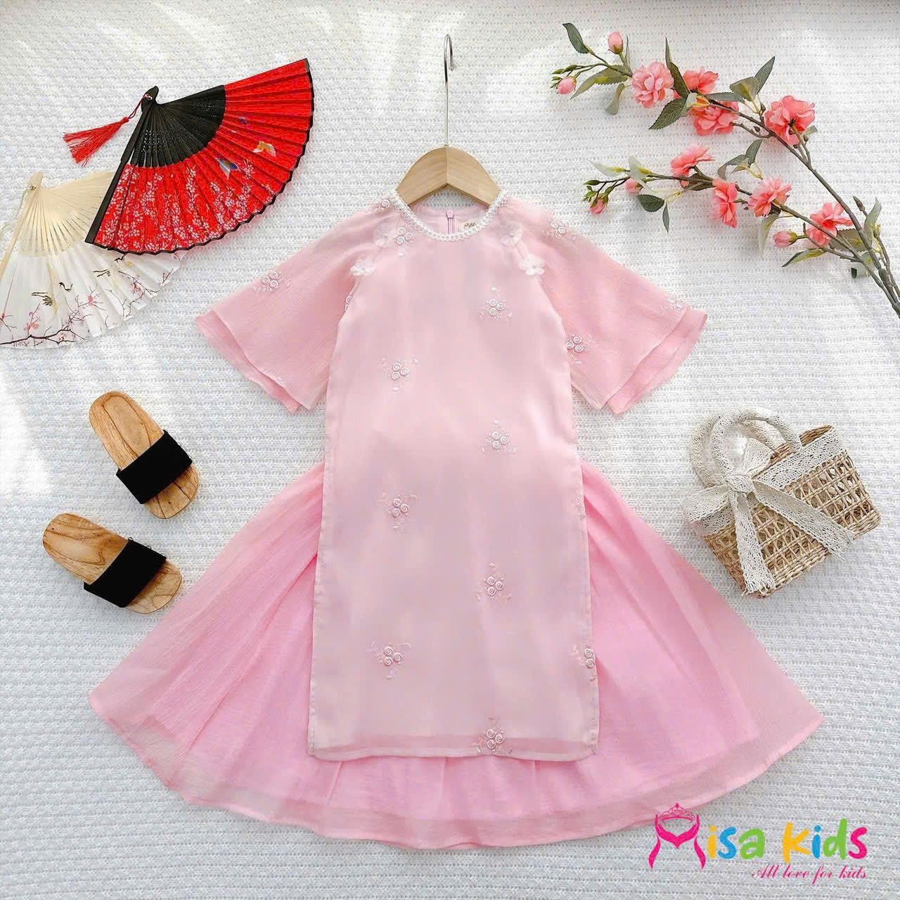 A463614 - Set Áo dài tơ thêu Hoa Hồng và tơ thêu Đình Hoa Mai siêu xinh cho bé gái chân váy xòe rời