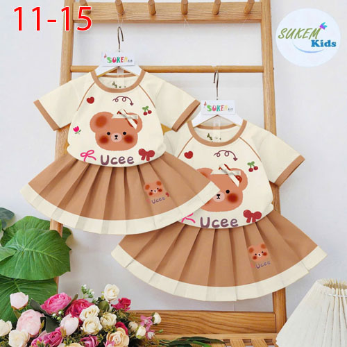 A464274 - Set váy áo may ngắn tay phối viền lé ép cham gấu đính nơ ruy băng chân váy xếp ly cắt phối