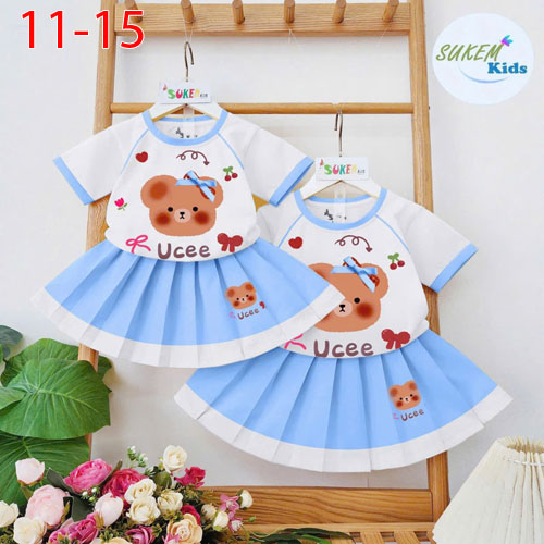 A464278 - Set váy áo may ngắn tay phối viền lé ép cham gấu đính nơ ruy băng chân váy xếp ly cắt phối