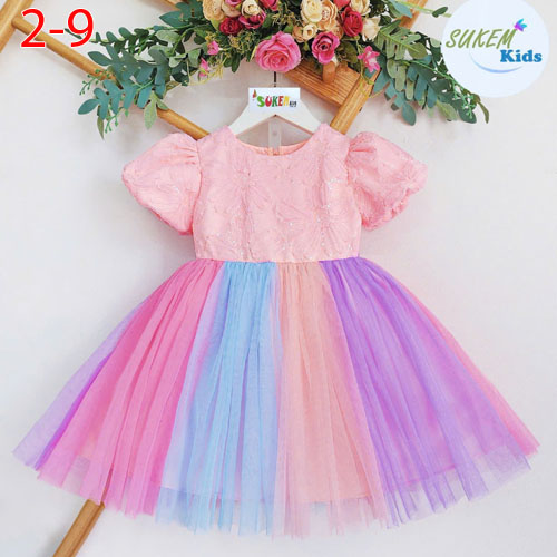 A464336 - Đầm ren hoa mai cắt laser tùng may 4 lớp nhún lưới cắt nối cầu vồng sắc màu nhún xòe_Size
