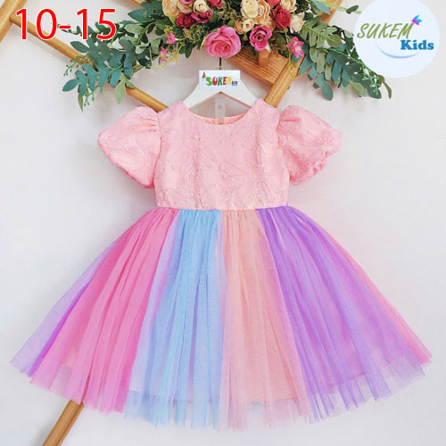 A464341 - Đầm ren hoa mai cắt laser tùng may 4 lớp nhún lưới cắt nối cầu vồng sắc màu nhún xòe_Size
