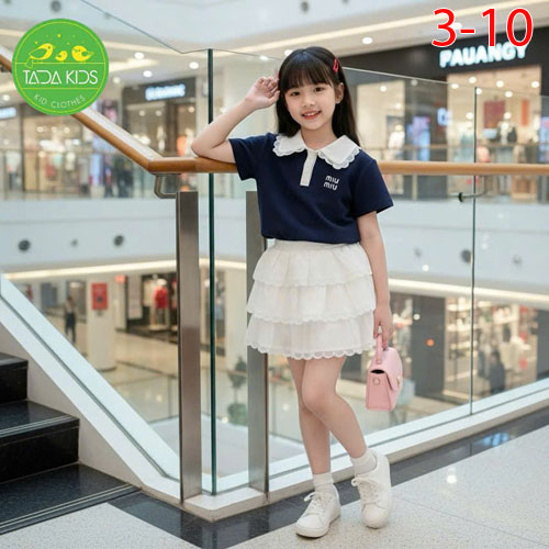A464465 - Bộ váy gái siêu kute áo thun cotton phối cùng chân váy tầng xịn sò viền ren_Size 3-10