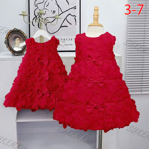A464958 - Đầm may nguyên ren hoa hồng 5d may 2 lớp pom A baby đầm chạy dây đính 3 Nơ_Size 3-7