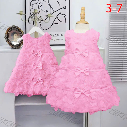 A464961 - (8/11)Đầm may nguyên ren hoa hồng 5d may 2 lớp pom A baby đầm chạy dây đính 3 Nơ_Size 3-7