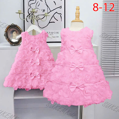 A464962 - Đầm may nguyên ren hoa hồng 5d may 2 lớp pom A baby đầm chạy dây đính 3 Nơ_Size 8-12