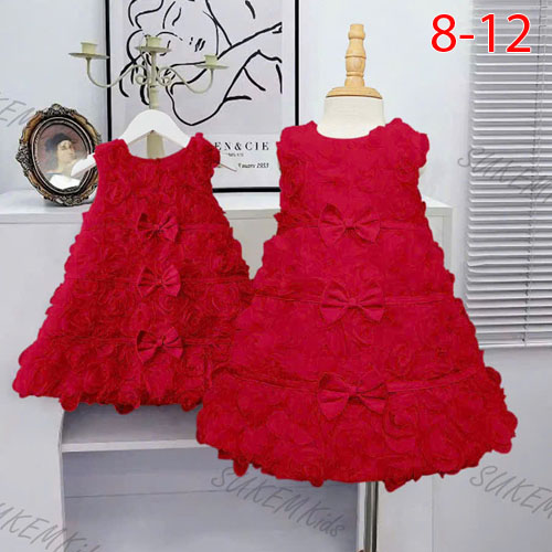 A464965 - Đầm may nguyên ren hoa hồng 5d may 2 lớp pom A baby đầm chạy dây đính 3 Nơ_Size 8-12