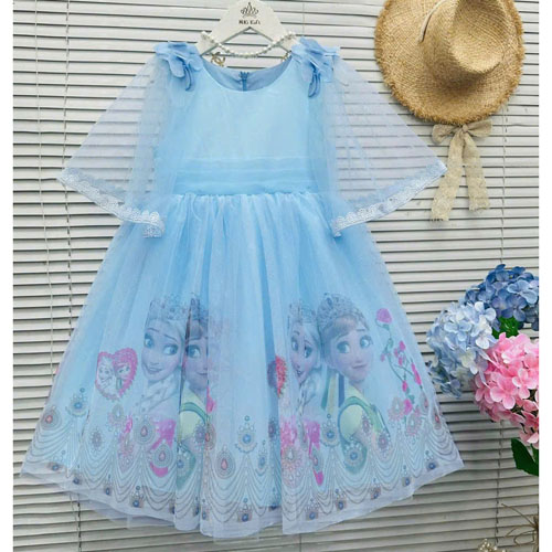 A465089 - Đầm công chúa tay bèo rũ viền ren tiểu thư,vai đính hoa in nữ hoàng băng giá Elsa_Size 3-1