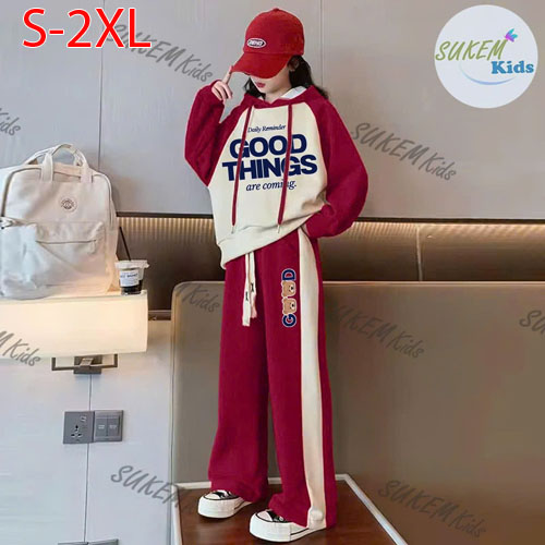 A466102 - (2/11)Bộ thun Hoodie dài tay cho bé gái áo may nón rút dây tay phối ráp lăng in GOOD THING