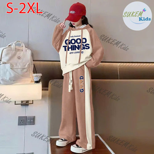 A466103 - (2/11)Bộ thun Hoodie dài tay cho bé gái áo may nón rút dây tay phối ráp lăng in GOOD THING