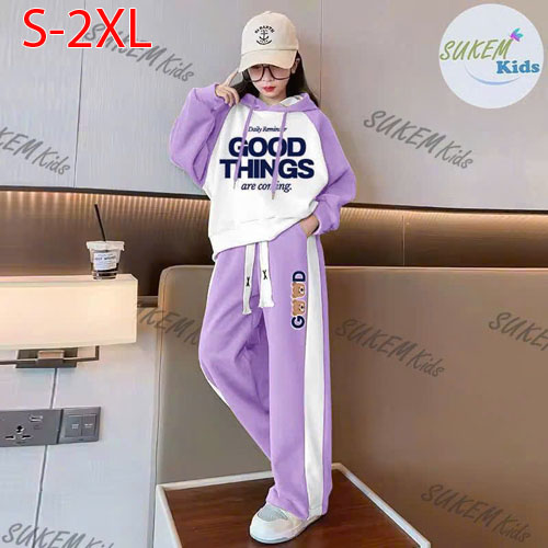 A466107 - (2/11)Bộ thun Hoodie dài tay cho bé gái áo may nón rút dây tay phối ráp lăng in GOOD THING