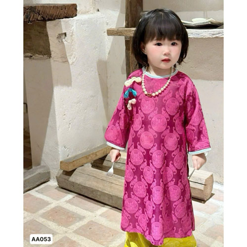 A466992 - Set áo dài lụa gấm bé diện siêu sang gồm Áo Quần Vòng Ngọc_Size 1-10