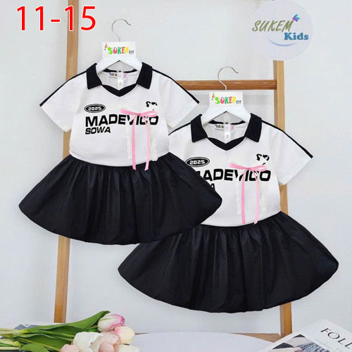 A467235 - Sét bí thể thao áo ngắn tay cổ trụ in thể thể thao đính nơ ruy băng thun coton 4c chân váy
