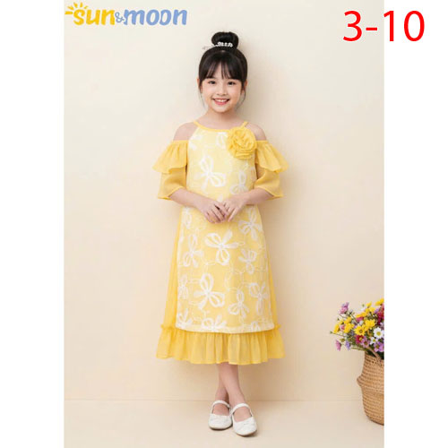 A467338 - Áo dài vol hoa cổ yếm tay 2 tầng bông quấn_Size 3-10