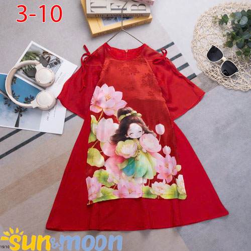 A467348 - Áo dài gấm phối tay lưới 2 nơ bé gái bông sen_Size 3-10
