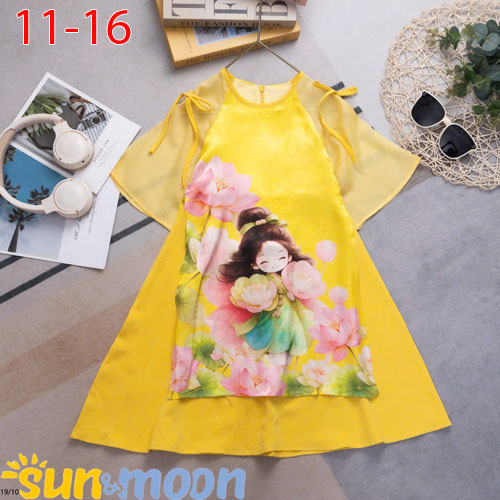 A467351 - Áo dài gấm phối tay lưới 2 nơ bé gái bông sen_Size 11-16