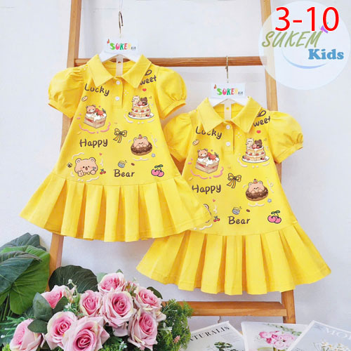 A467354 - Đầm thun cổ trụ tay phồng xinh in phun đầm họa tiết ép Gấu may xếp ly đuôi cá_Size 3-10