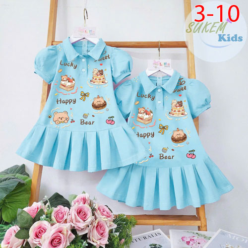 A467356 - Đầm thun cổ trụ tay phồng xinh in phun đầm họa tiết ép Gấu may xếp ly đuôi cá_Size 3-10