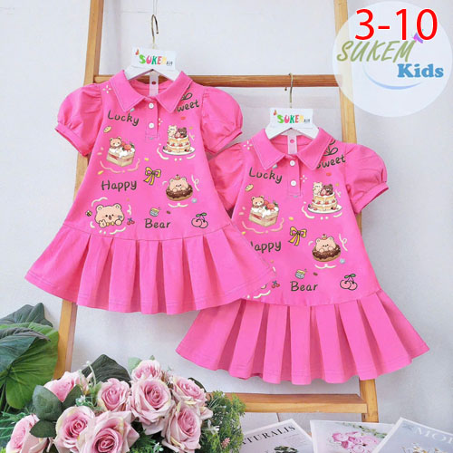 A467357 - Đầm thun cổ trụ tay phồng xinh in phun đầm họa tiết ép Gấu may xếp ly đuôi cá_Size 3-10