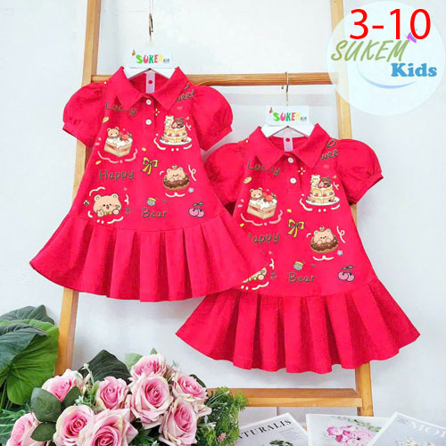 A467358 - Đầm thun cổ trụ tay phồng xinh in phun đầm họa tiết ép Gấu may xếp ly đuôi cá_Size 3-10