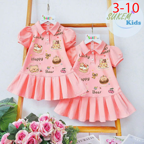 A467359 - Đầm thun cổ trụ tay phồng xinh in phun đầm họa tiết ép Gấu may xếp ly đuôi cá_Size 3-10