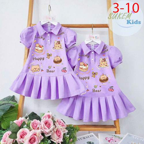A467360 - Đầm thun cổ trụ tay phồng xinh in phun đầm họa tiết ép Gấu may xếp ly đuôi cá_Size 3-10