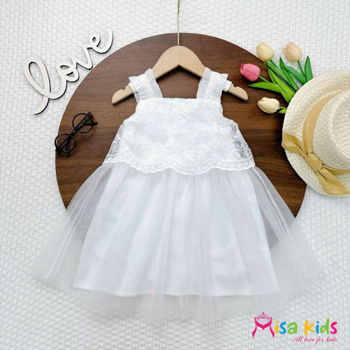 A467986 - Đầm ren hoa phối lưới bé gái xòe form A vai bèo tơ trơn thân dưới 1 lớp lưới trơn 1 lớp lư