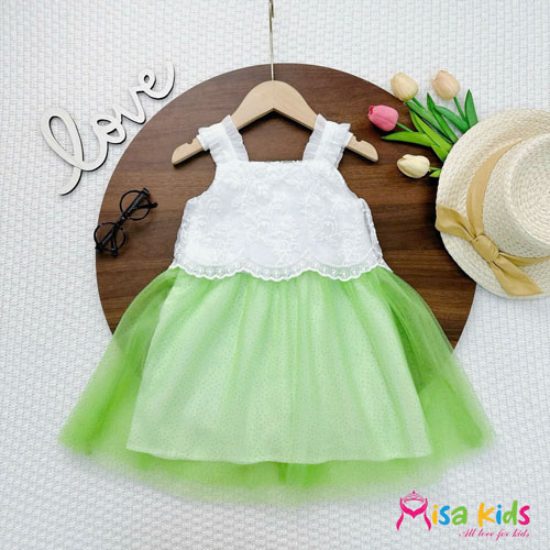 A467987 - Đầm ren hoa phối lưới bé gái xòe form A vai bèo tơ trơn thân dưới 1 lớp lưới trơn 1 lớp lư