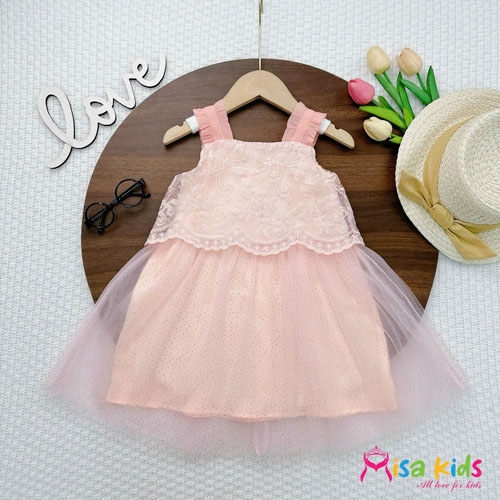 A467988 - Đầm ren hoa phối lưới bé gái xòe form A vai bèo tơ trơn thân dưới 1 lớp lưới trơn 1 lớp lư