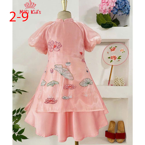 A468395 - Áo dài cách tân cho bé gái tay bồng thêu hoa sen lớp ngoài voan lưới thêu, lớp trong lót t