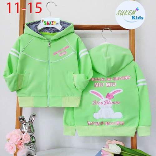 A469549 - Áo khoác thêu đắp thỏ bông xù với nón phối vải xinh cho bé đắp túi chạy dây viền lé thể th
