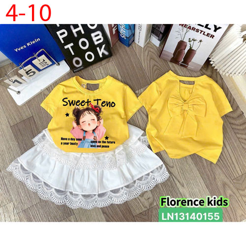 A469553 - Set váy ren cực xinh cho bé áo thun cotton in cô bé nơ đính sau lưng điệu đà chân váy ren