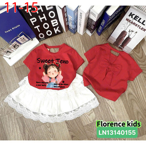 A469557 - Set váy ren cực xinh cho bé áo thun cotton in cô bé nơ đính sau lưng điệu đà chân váy ren