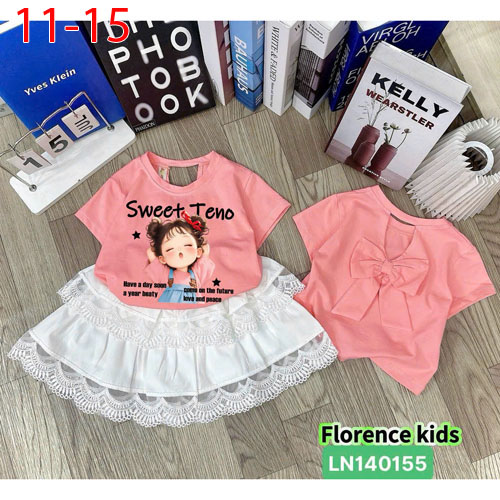 A469558 - Set váy ren cực xinh cho bé áo thun cotton in cô bé nơ đính sau lưng điệu đà chân váy ren