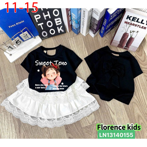 A469559 - Set váy ren cực xinh cho bé áo thun cotton in cô bé nơ đính sau lưng điệu đà chân váy ren