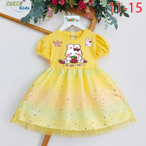 A470903 - Đầm may tay phồng in thỏ cute thân trên vải thun coton 4c 2 lớp lưới cầu vồng kim sa xòe_S