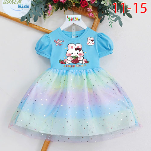 A470905 - Đầm may tay phồng in thỏ cute thân trên vải thun coton 4c 2 lớp lưới cầu vồng kim sa xòe_S