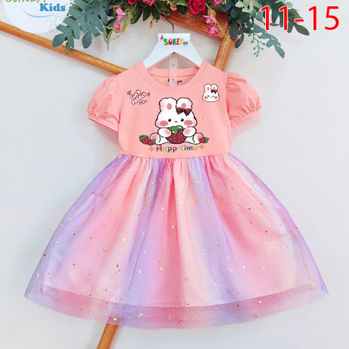 A470907 - Đầm may tay phồng in thỏ cute thân trên vải thun coton 4c 2 lớp lưới cầu vồng kim sa xòe_S