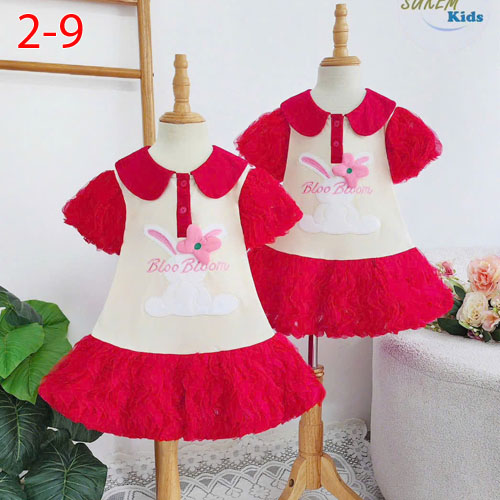 A471060 - Đầm may cổ lá sen thêu đắp thỏ cute dễ thương với tay phồng bồng bềnh đuôi cá vải ren xịn