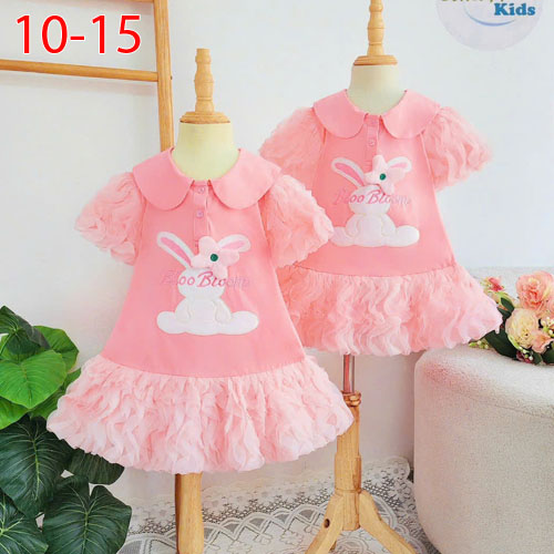 A471066 - Đầm may cổ lá sen thêu đắp thỏ cute dễ thương với tay phồng bồng bềnh đuôi cá vải ren xịn