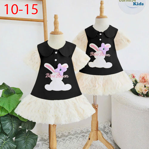 A471067 - Đầm may cổ lá sen thêu đắp thỏ cute dễ thương với tay phồng bồng bềnh đuôi cá vải ren xịn