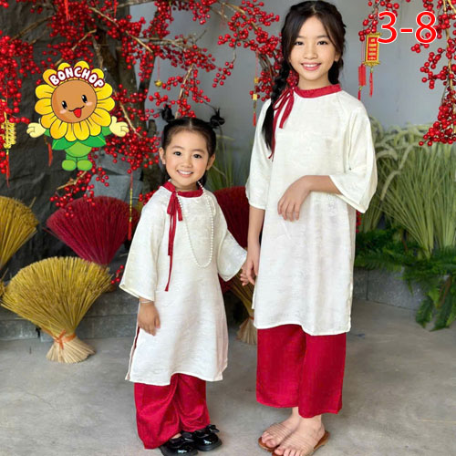 A471244 - Áo dài Tết cho các thiên thần nhỏ gấm lụa cao cấp hình Hoa mai Hồng Phúc An Nhiên_Size 3-8