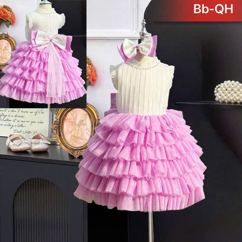 A473363 - Đầm bé gái voan lưới thân xếp ly cổ đính hạt thủ công tùng nhiều tầng voan mềm xòe_Size 1-