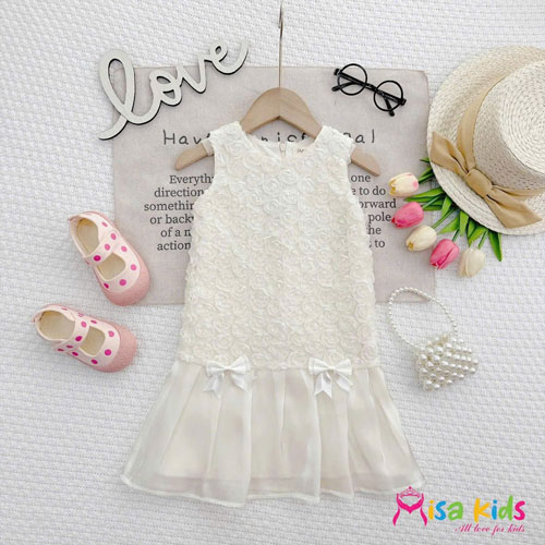 A473477 - Đầm Hoa Hồng 3D phối Tùng orrganza gắn nơ 2 bên_Size 1-10