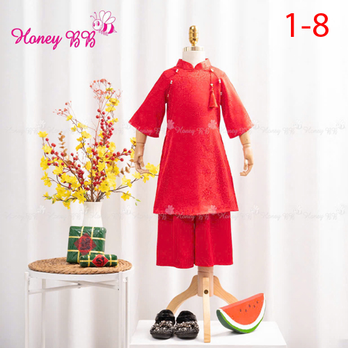 A475063 - Set áo dài bé gái áo gấm lụa mềm mại quần Latinh loại 1 hình in hoa văn nguyên cây_Size 1-