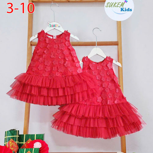 A477385 - Đầm may nguyên ren hoa mai 5d may đuôi cá nhún lưới 3 tầng_Size 3-10