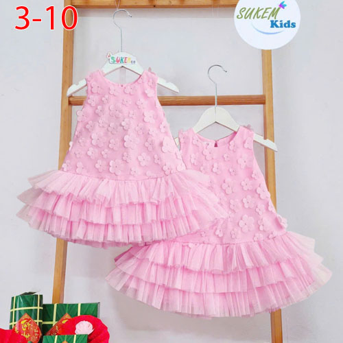 A477390 - Đầm may nguyên ren hoa mai 5d may đuôi cá nhún lưới 3 tầng_Size 3-10